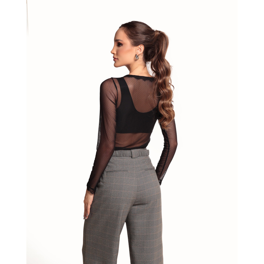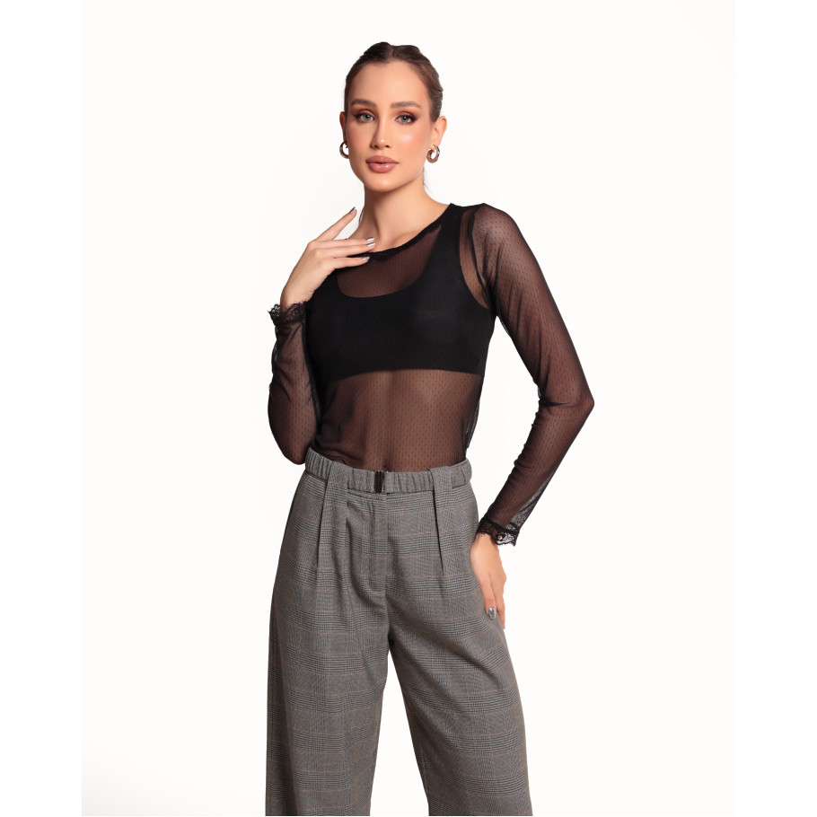 Blusa em tule, tecido leve e macio ao toque, uma peça delicada com detalhes que fazem a diferença, o tule com pois, aoplicação de renda no decote e punhos.