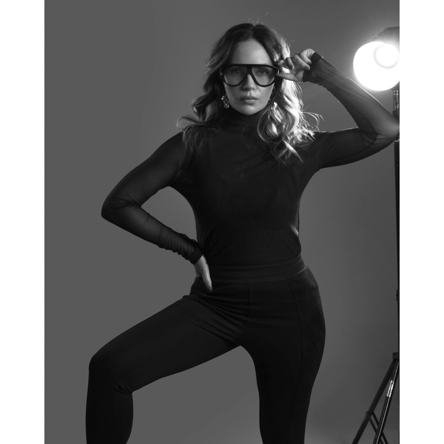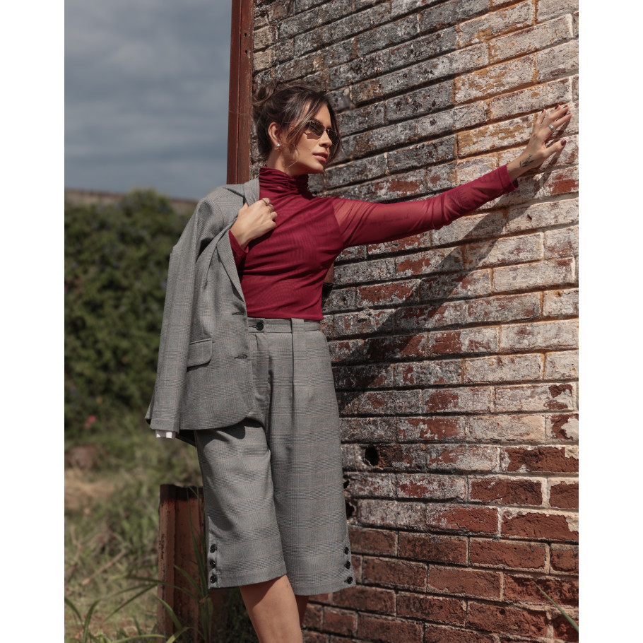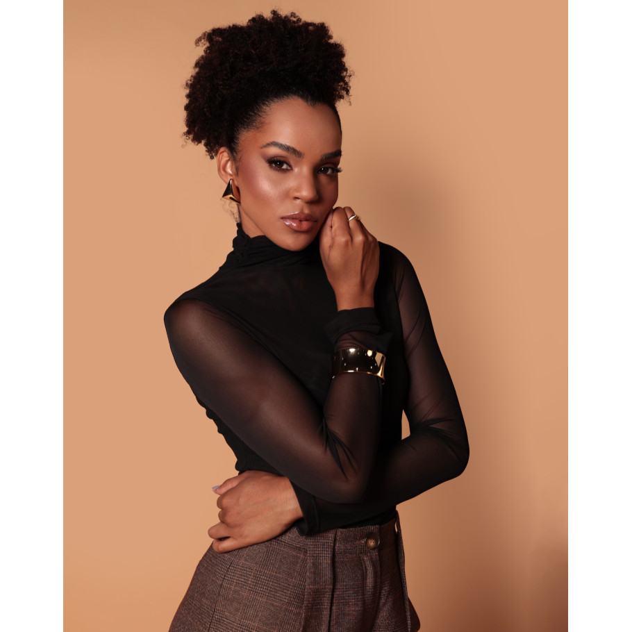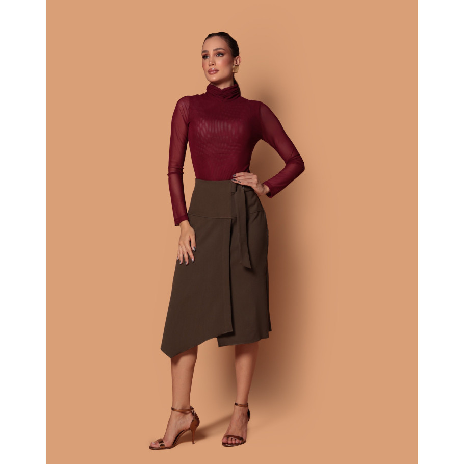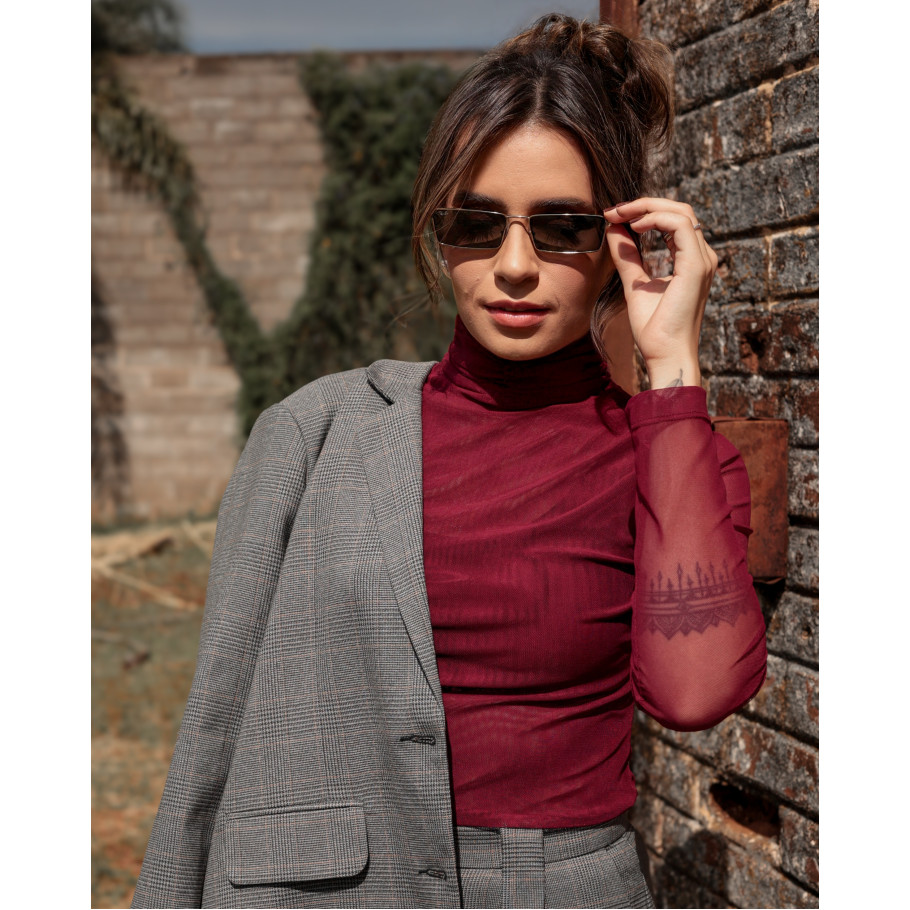 Blusa em tule, frente e costas dupla, gola alta drapeada, manga longa.