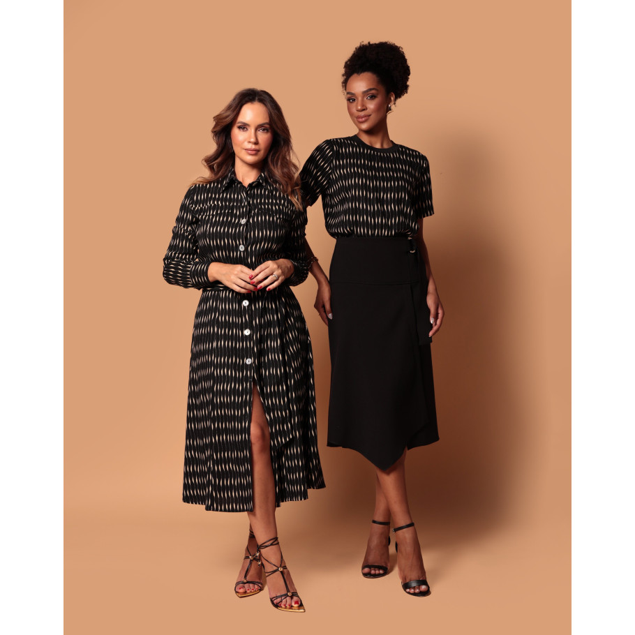 Blusa em linho misto estampada , gola de ribana, manga curta, barra com recortes nas laterais ! Uma peça moderna e versátil para compor em variáos looks.