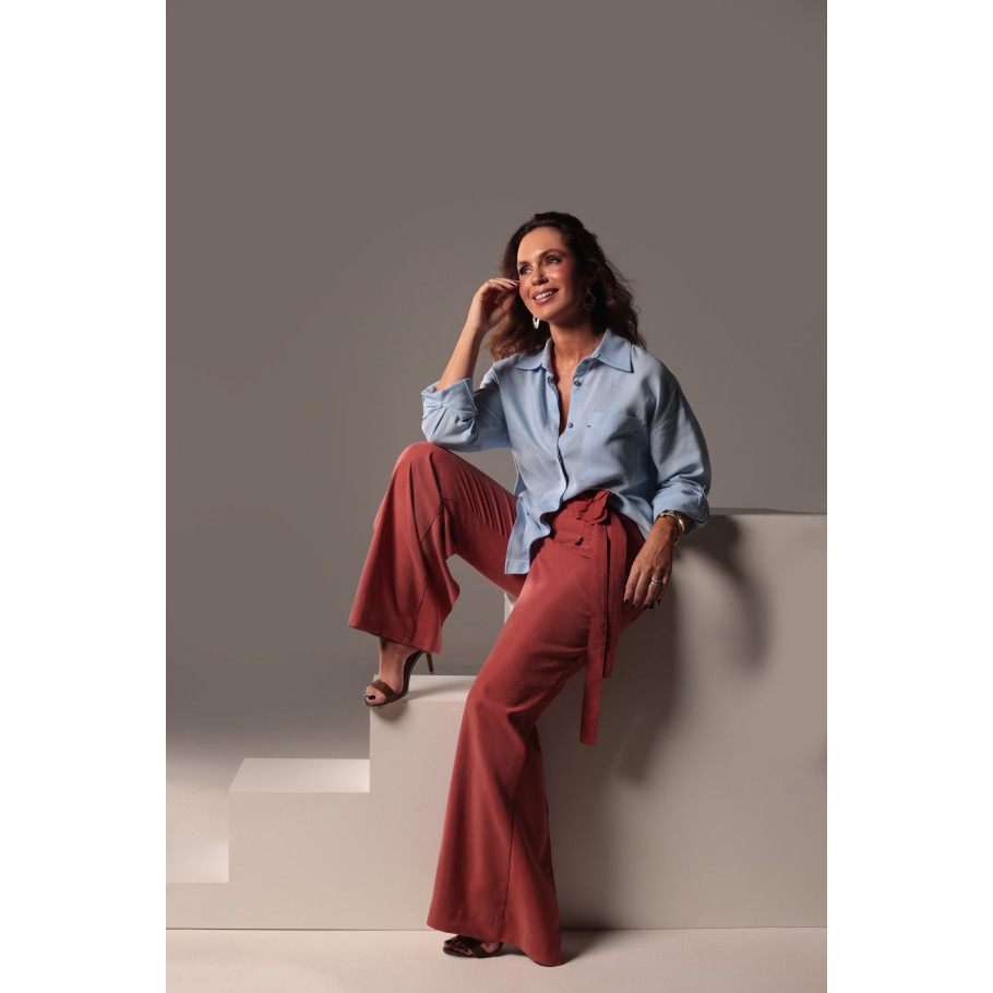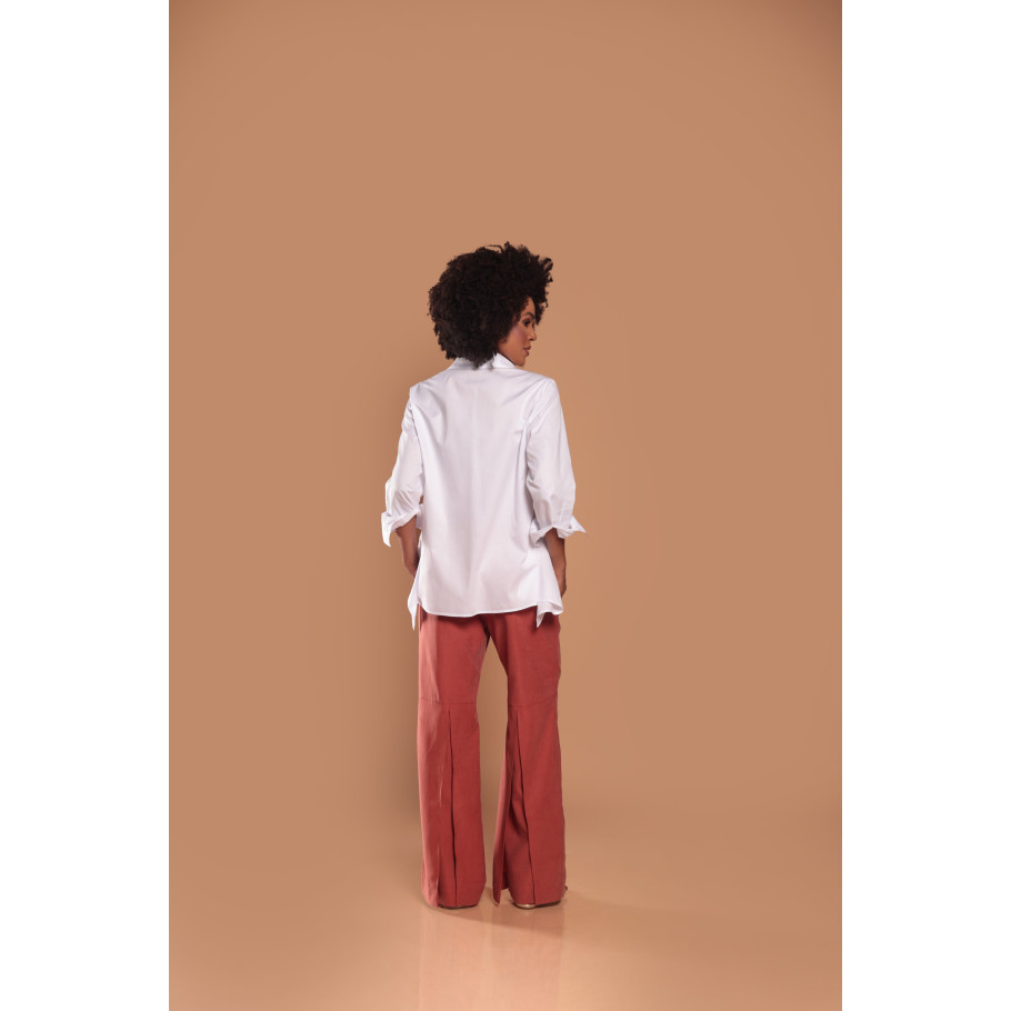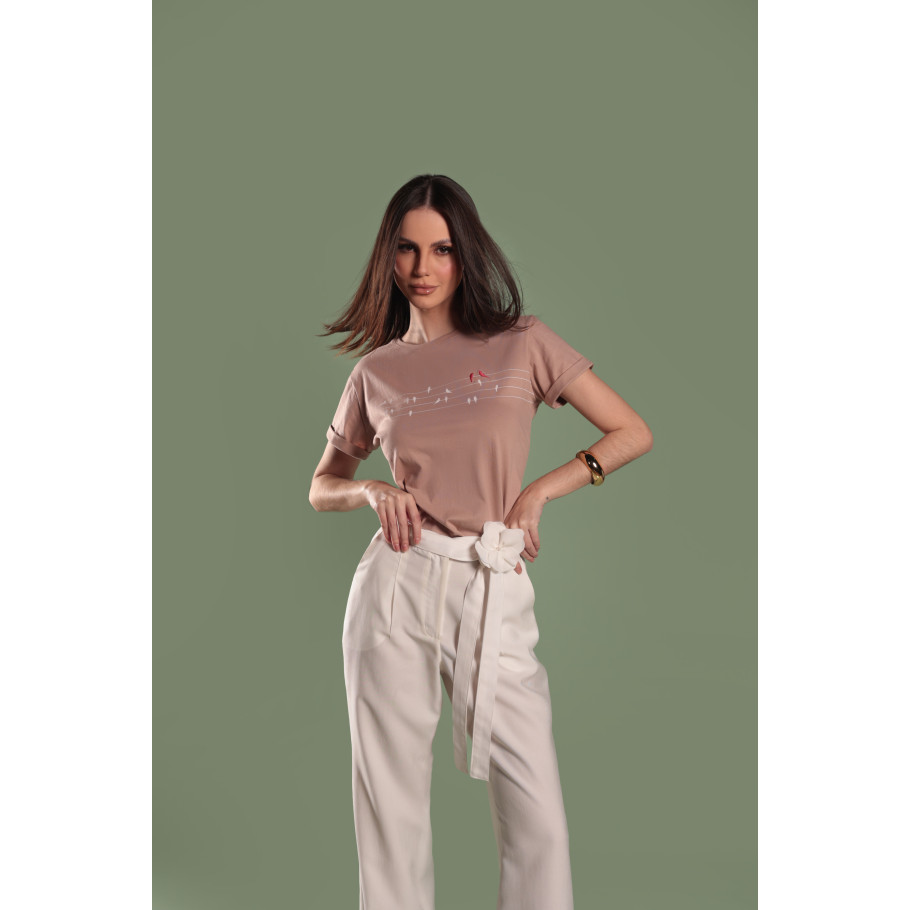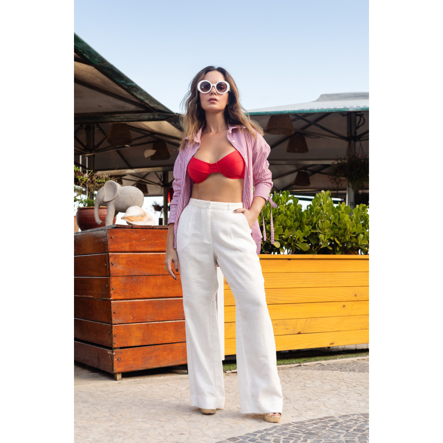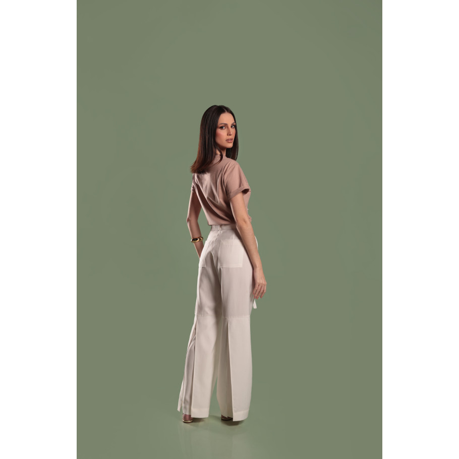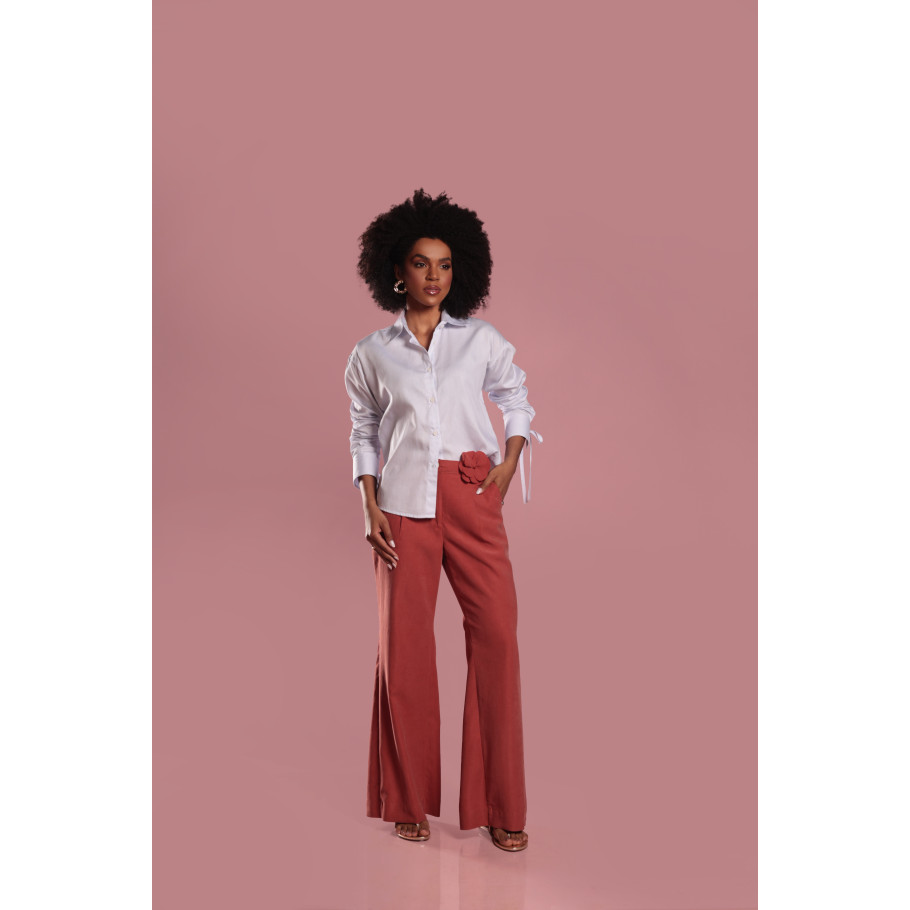 Calça em alfaiataria twill, tecido com caimento e toque leve, bolsos laterais e traseiros, pregas frontais, nesgas nas pernas, acompanha faixa e broche flor e na cor off white shorts  segunda pele.