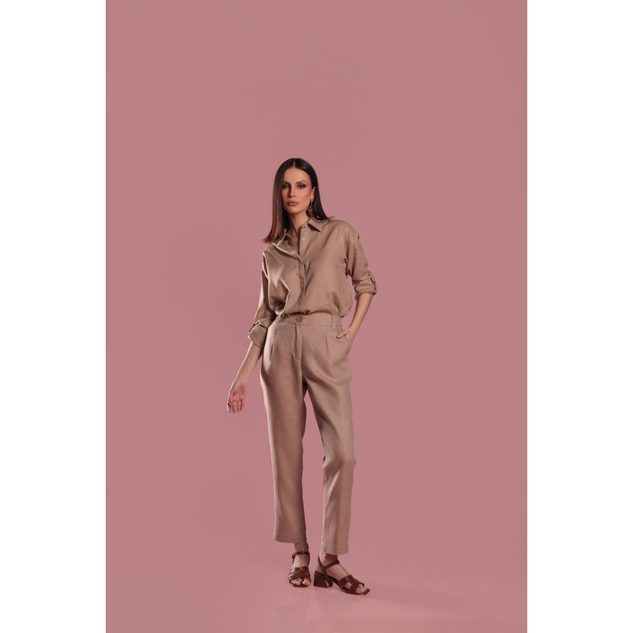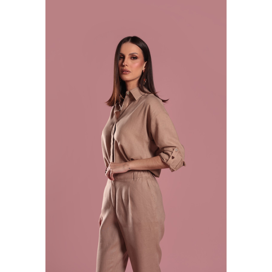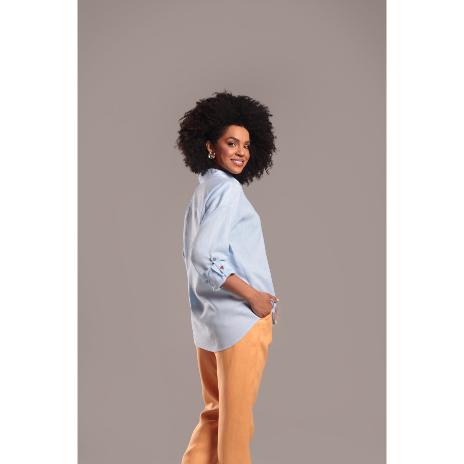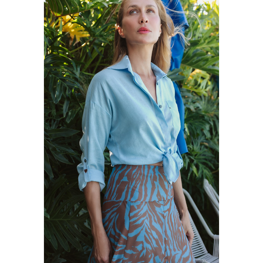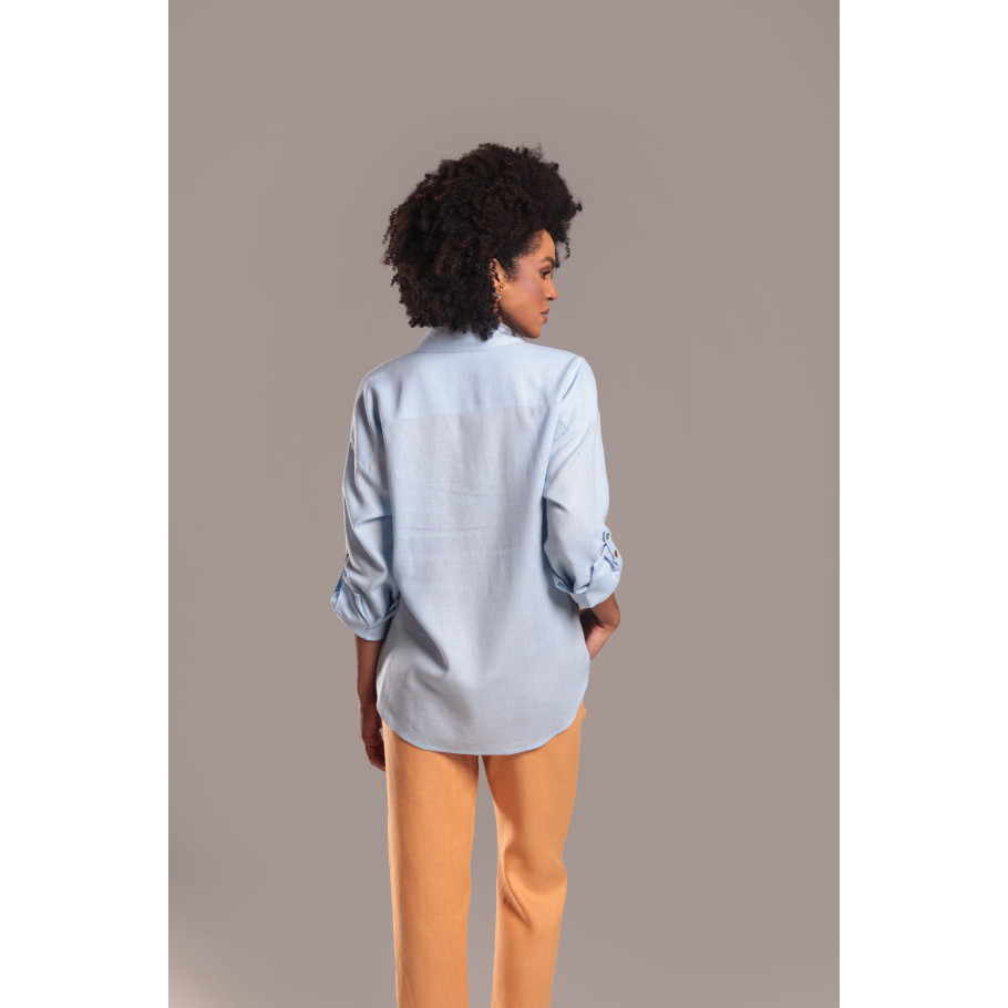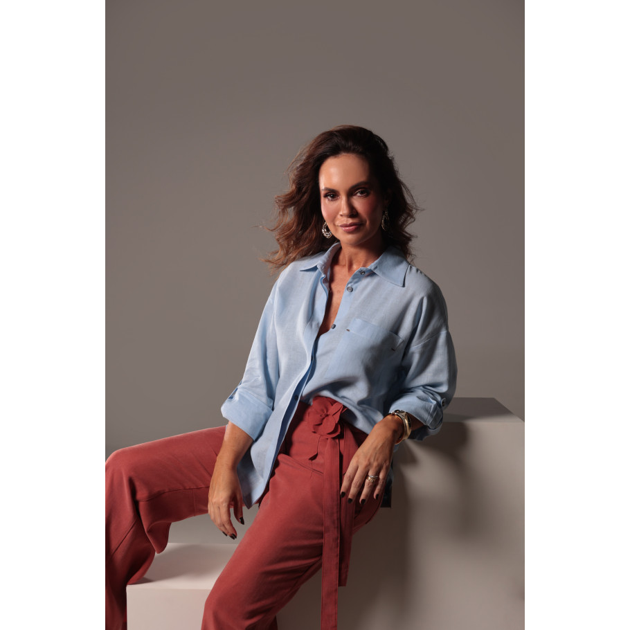 A camisa essencial é um clássico da marca Fèe, na cor blue classic ela veio com bolso e botões trabalhados, já na cor macchiato ela veio com a proposta sem bolso e botões em madrepérolas. Ambas com martingale bordado de coração.