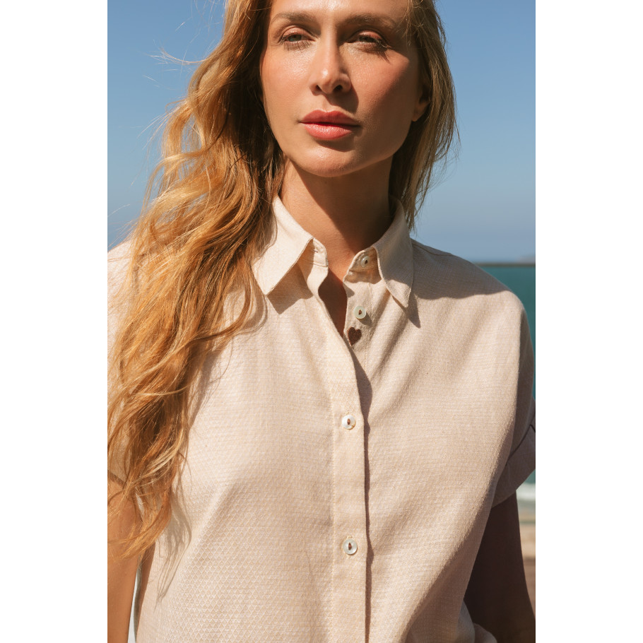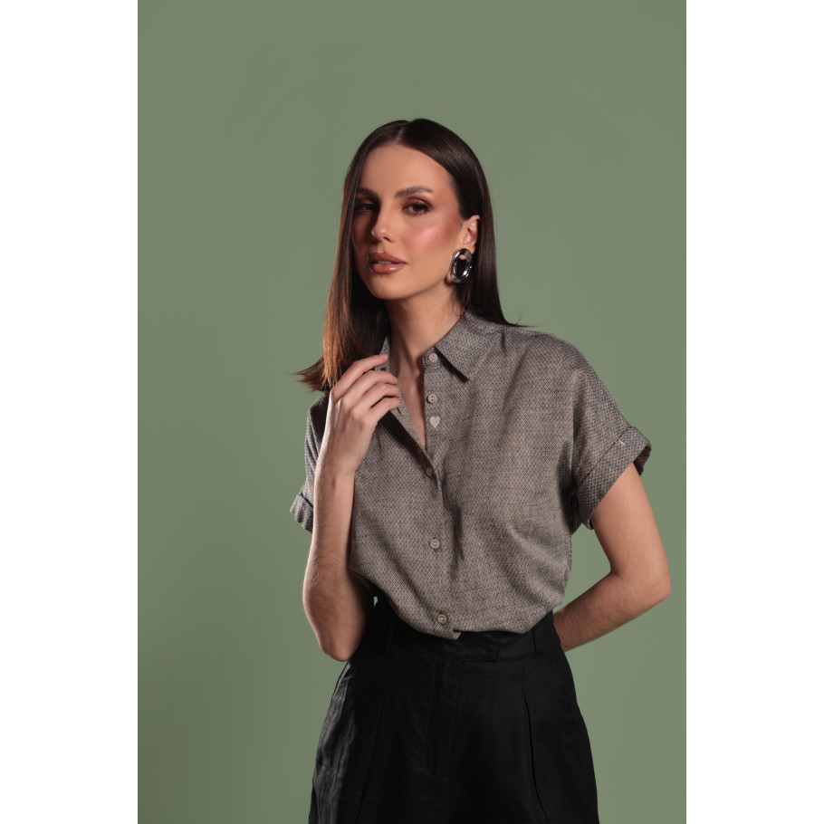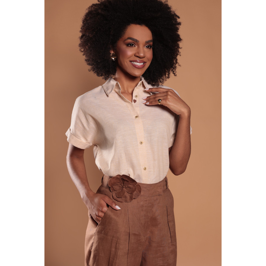 Camisa manga curta, pregas nas costas, tecido com uma leve textura delicada que lembra uma favo de mel, bordado de coração na vista, botões marmorizados, barra italiana nas mangas com travetes bordados.