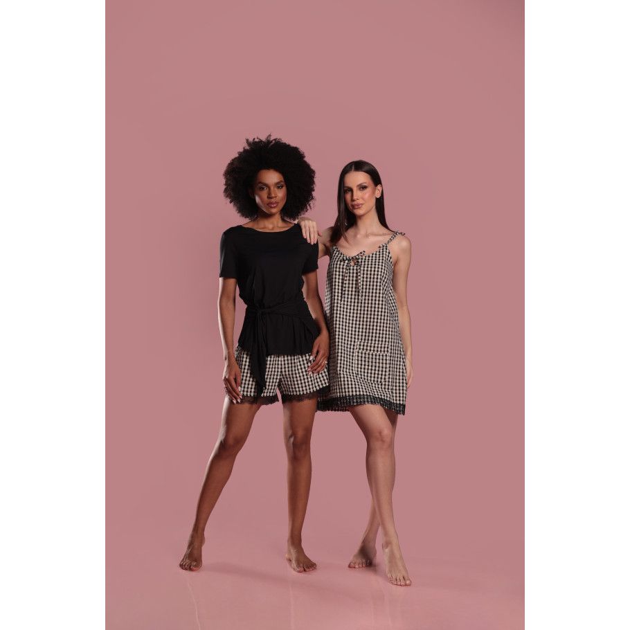 Camisola em algodao alças ajustaveis com laços, barra com aplicaçoes em renda, bolsos frontais, elastico nas costas para maior conforto.