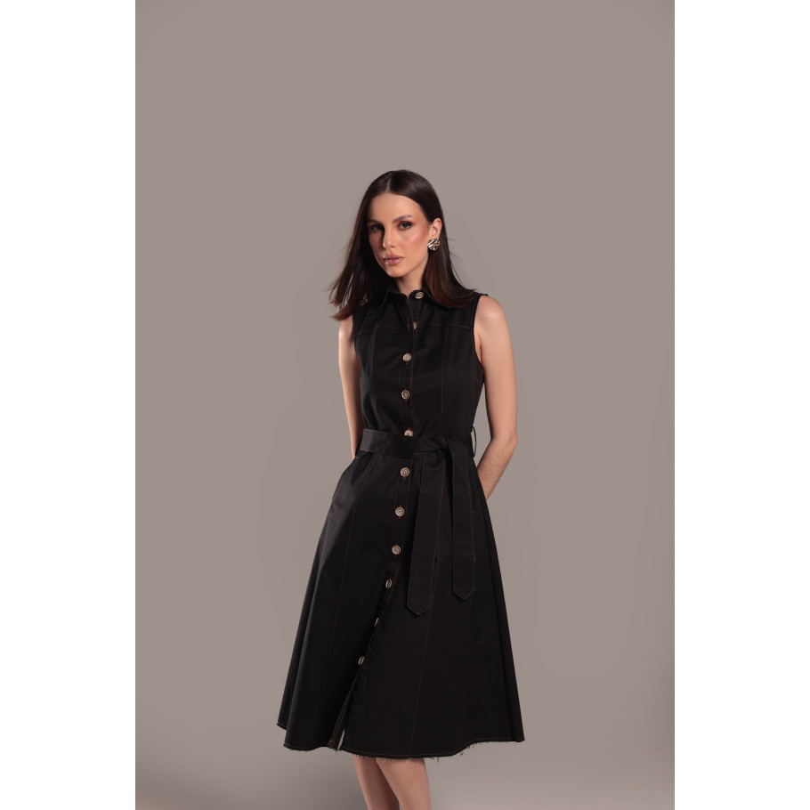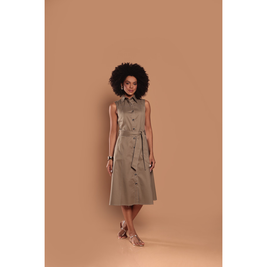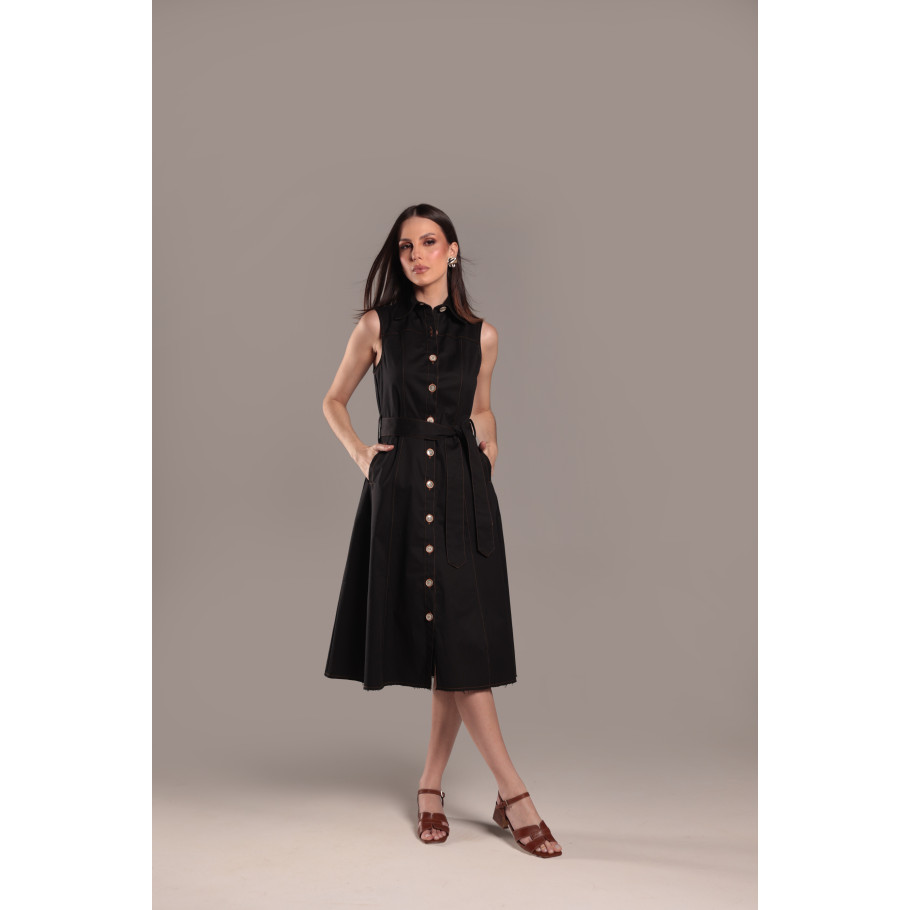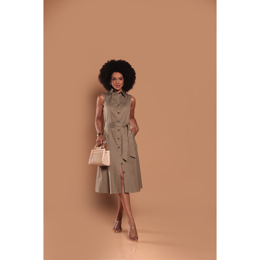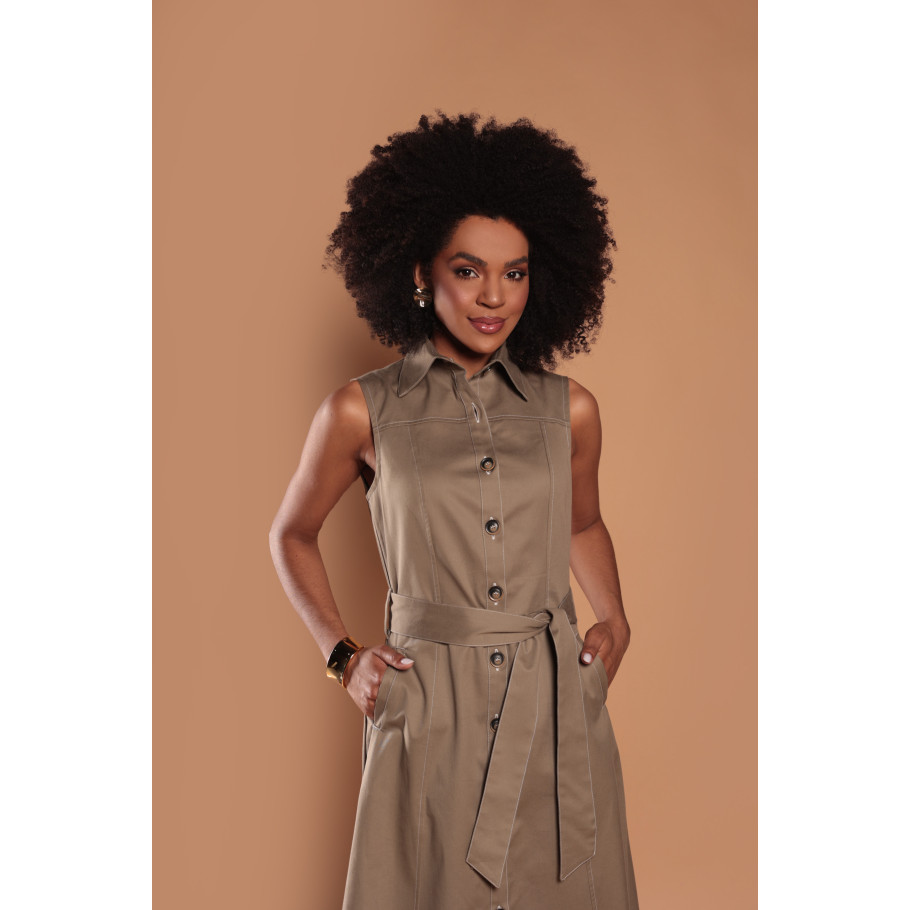 Chemise/Vestido sem mangas em sarja, bolsos, passantes, acompanha faixa, botões em resina, pesponto contrastando por toda a peça.