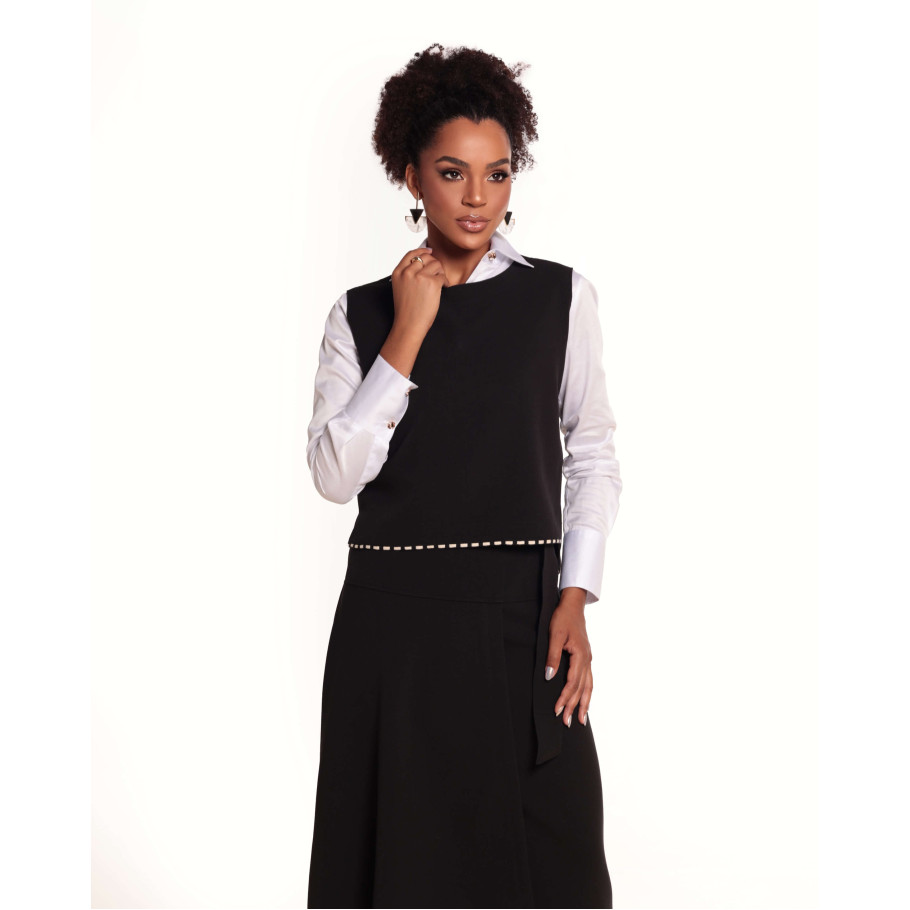 Colete em alfaiataria executive, sem magas, barrado com aviamento. Uma peça versatil que compõe qualquer look.