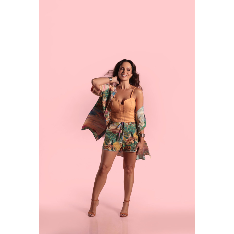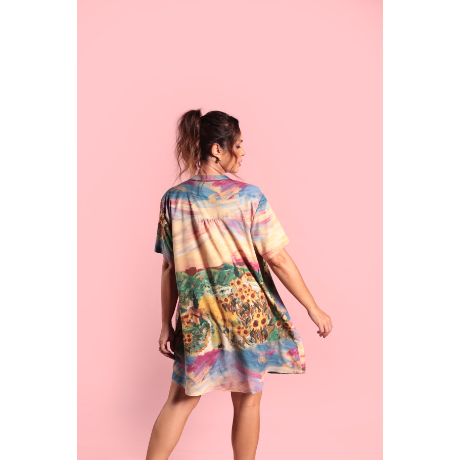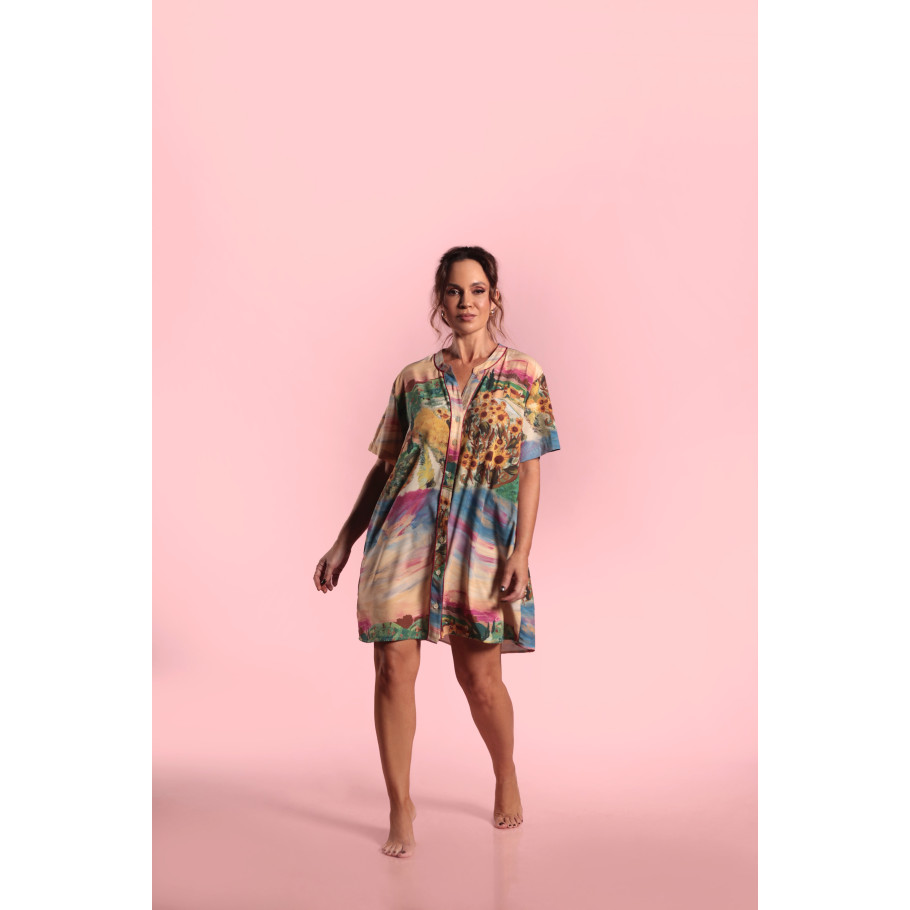 Dress code no silk flow, tecido confortável pratico e leve, estampa personalizada inspirada nas obras de Van Gogh, botões trabalhados, vivo em cores contrastantes, shorts modelo "corredor" cós liso na frente para um acabamento mais elegante e elástico nas costas trazendo maior conforto, cordão com laço que da um charme a mais a peça.
