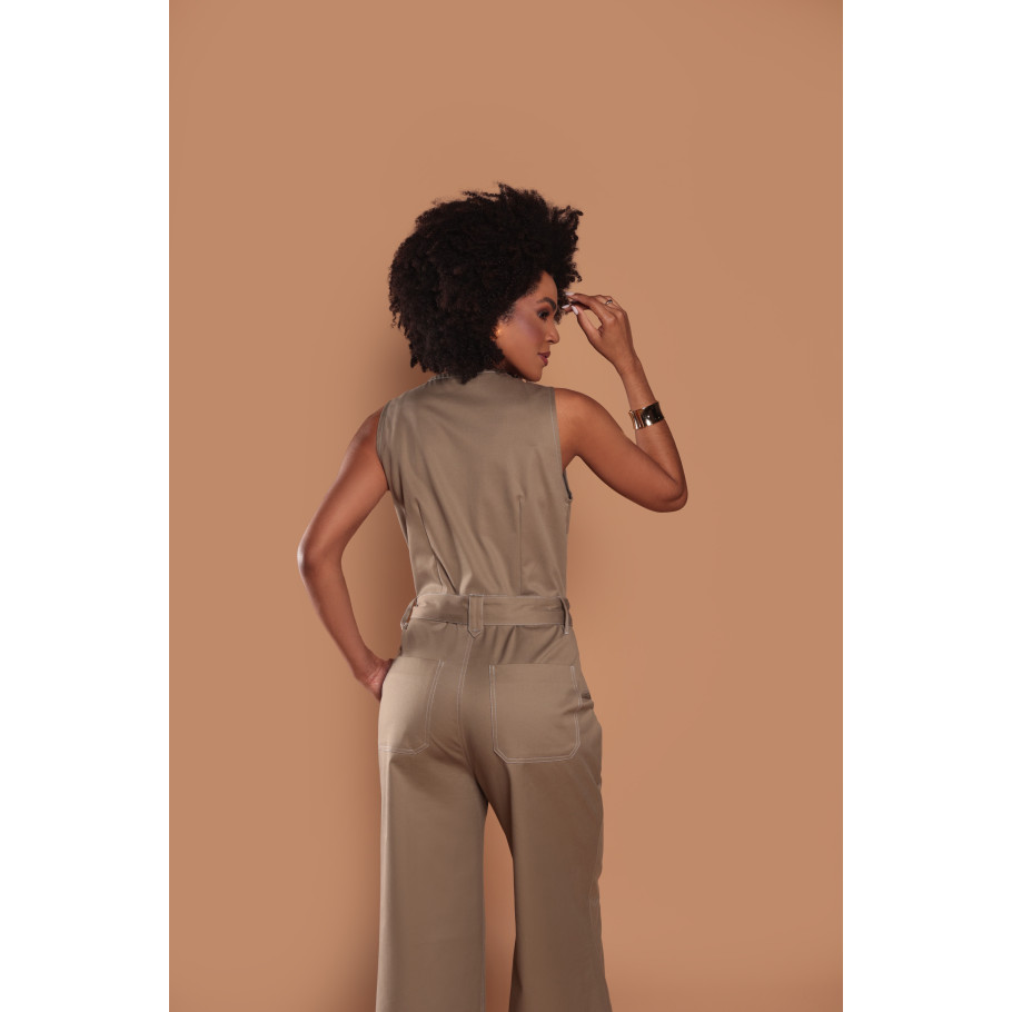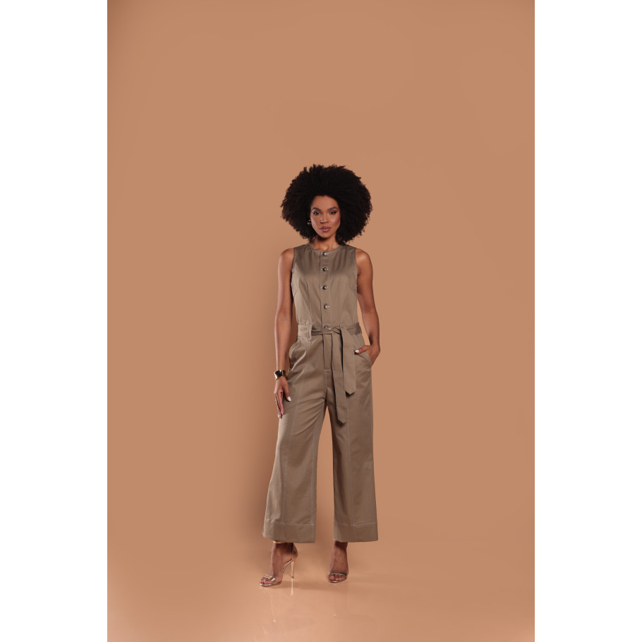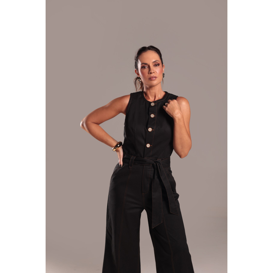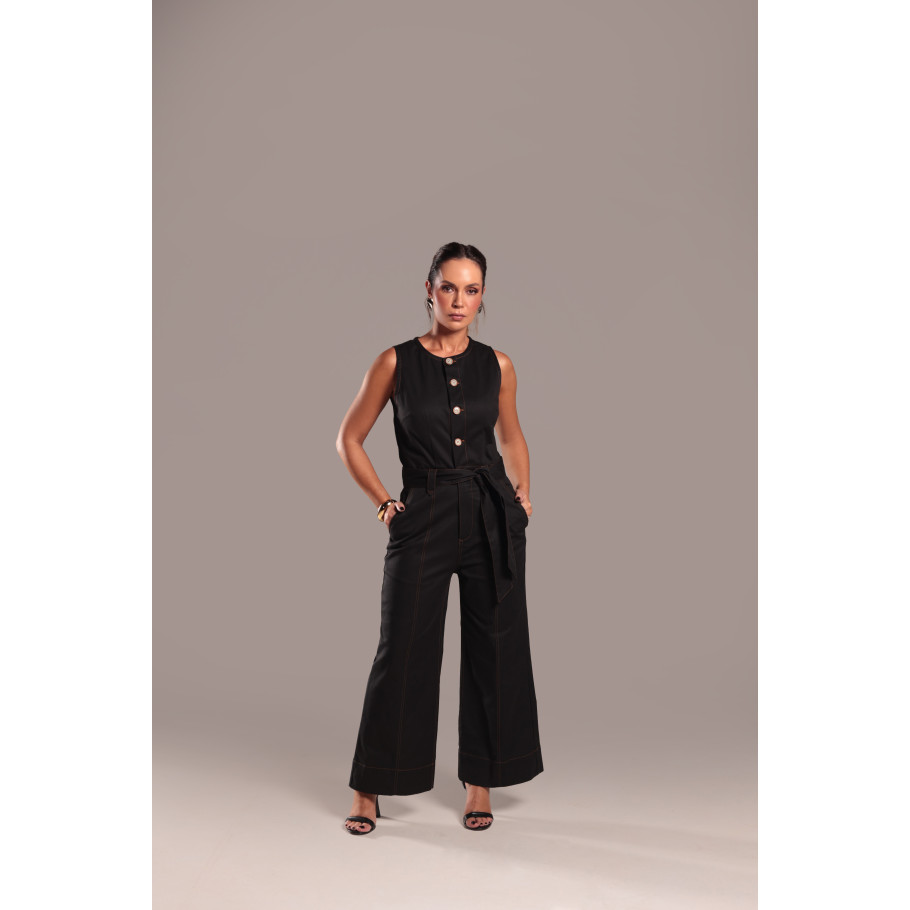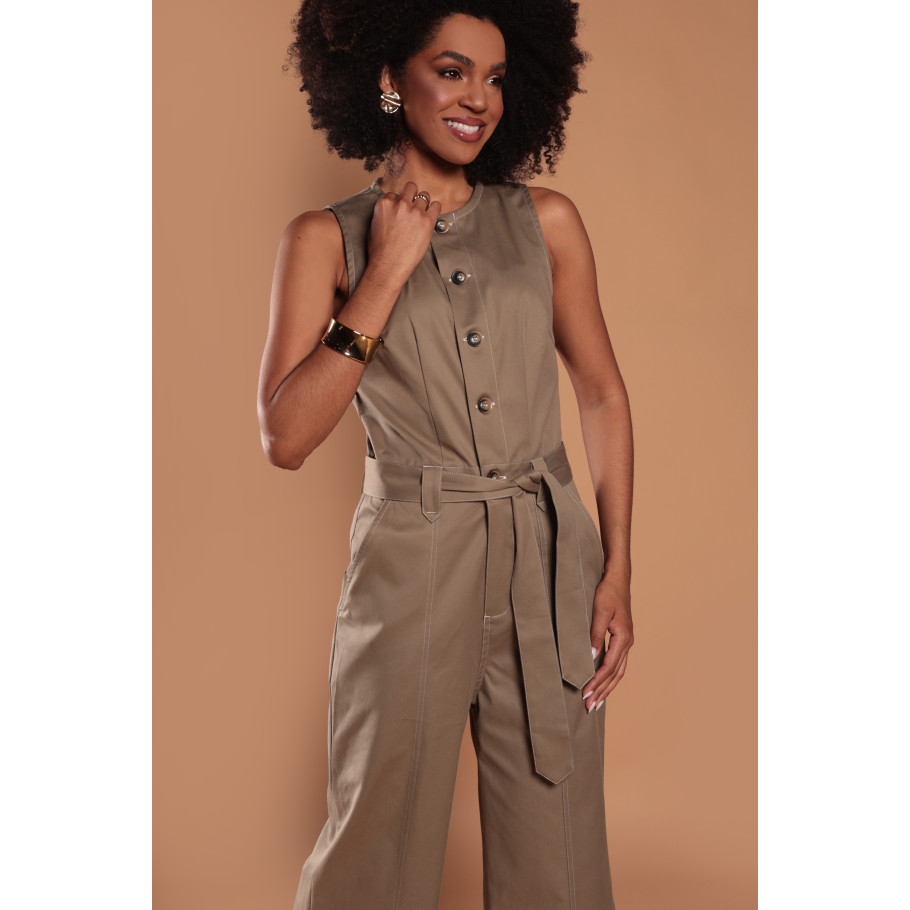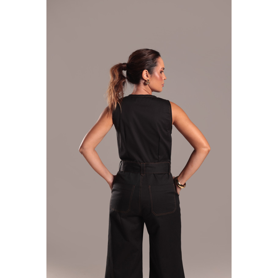 Macacão regata em sarja, bolsos laterais e traseiros, botões em resina, pesponto contrastando por toda a peça, acompanha faixa.