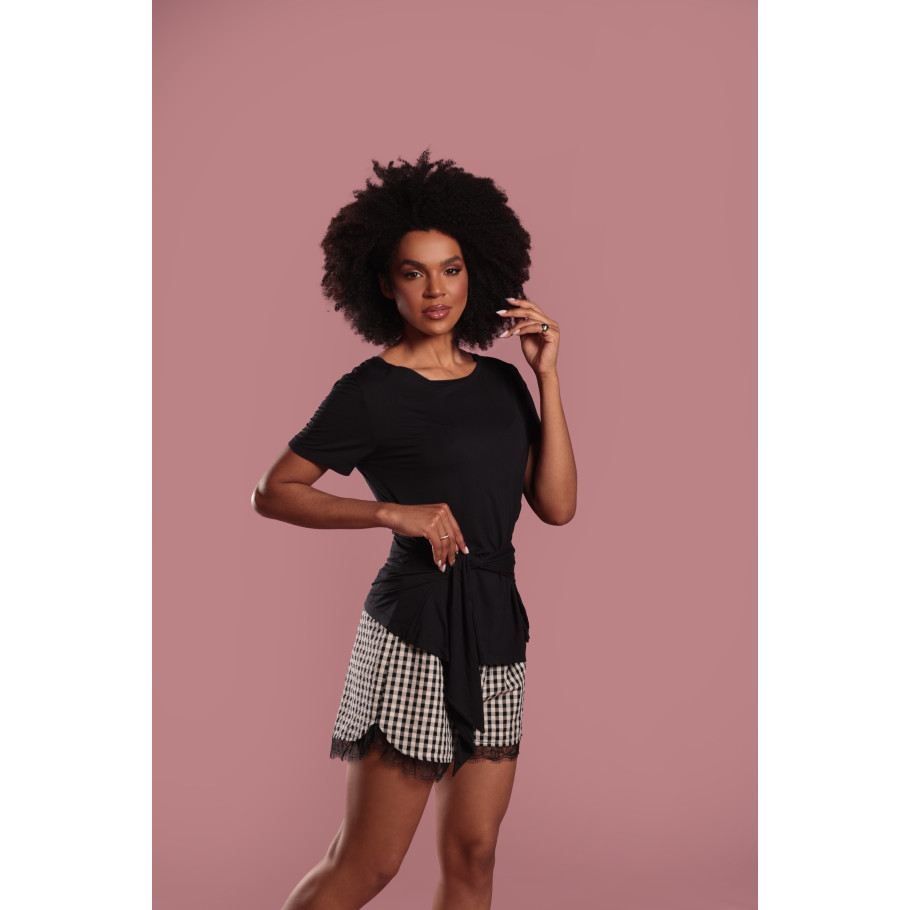 Blusa em malha com toque macio e confortável, modelagem, moderna amarração lateral, shorts  em algodão, cintura com elástico, barrado com aplicações em renda, acompanha saquinho da mesma estampa da shorts. Ótima opção para presente ou viagem.