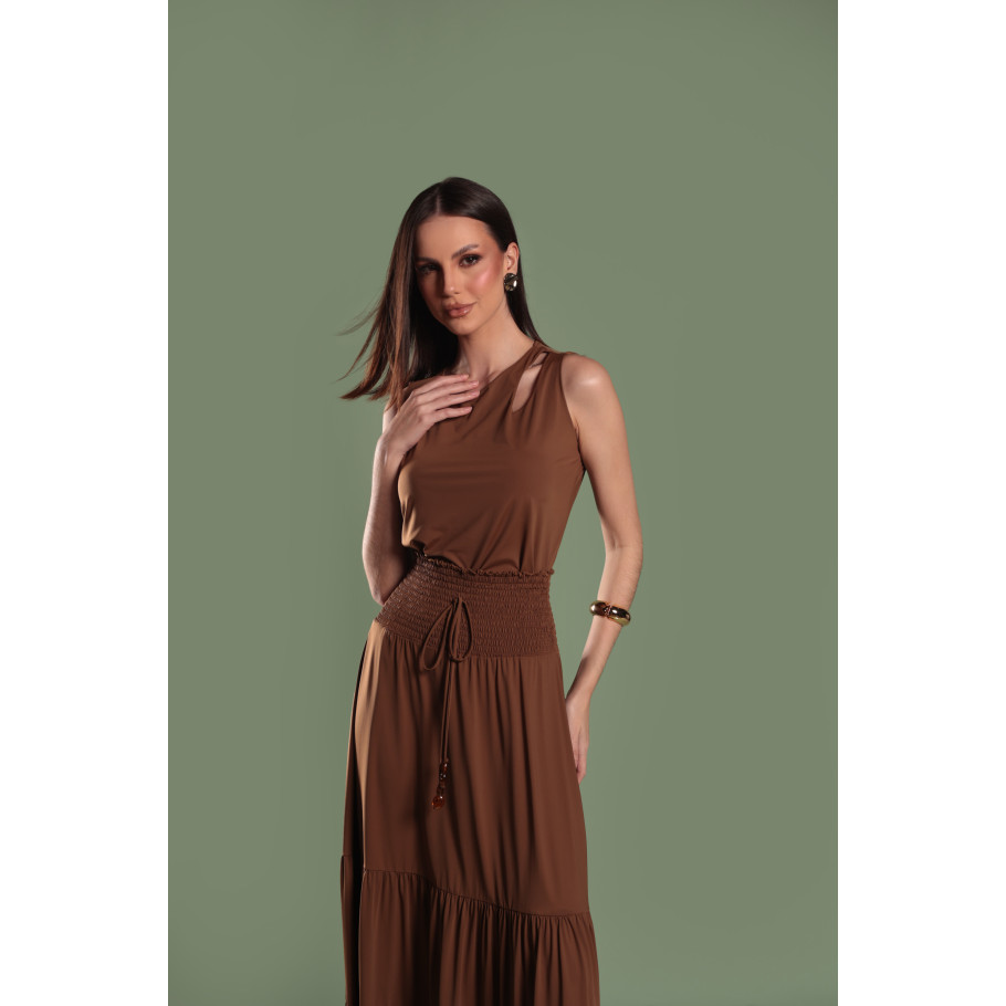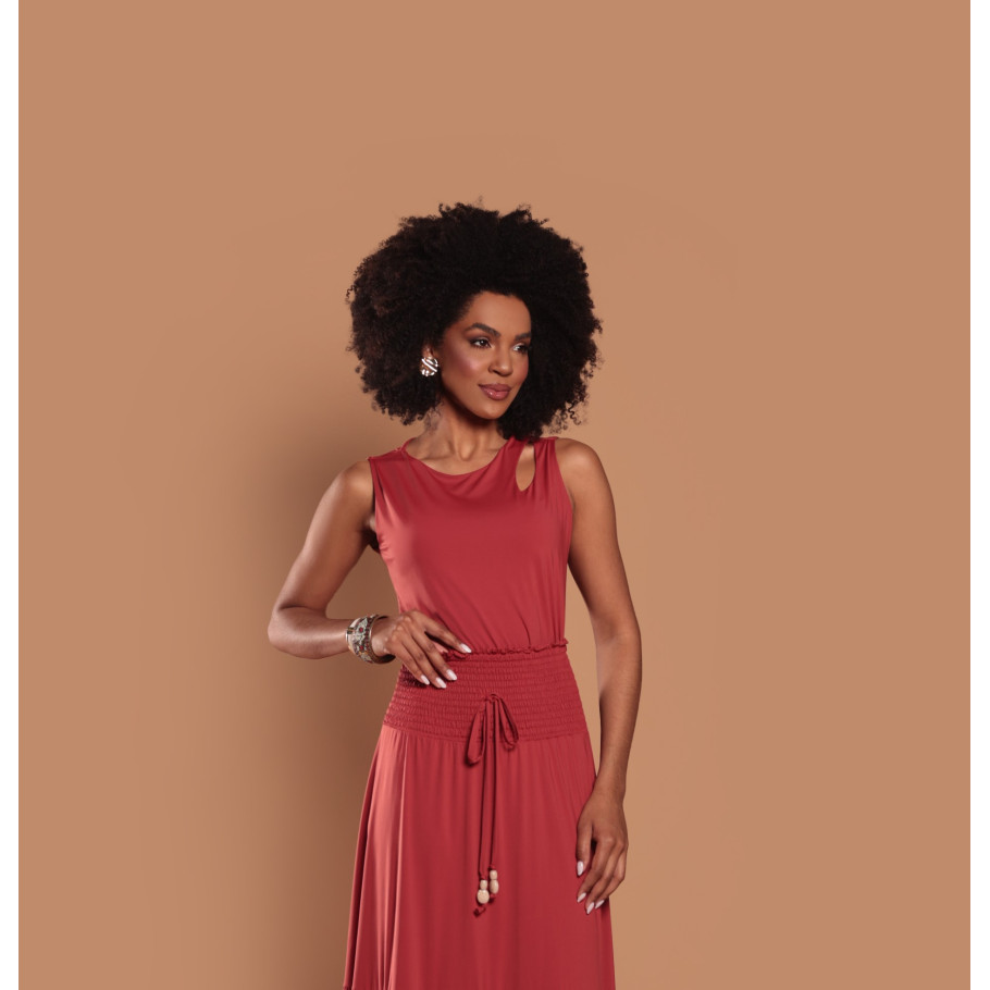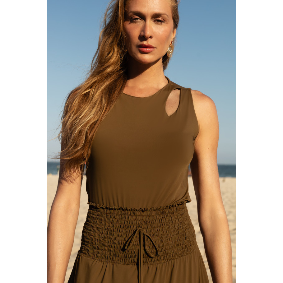 Regata em malha fluity, decote redondo, recorte em formato de gota na lateral que traz um charme especial para a peça.