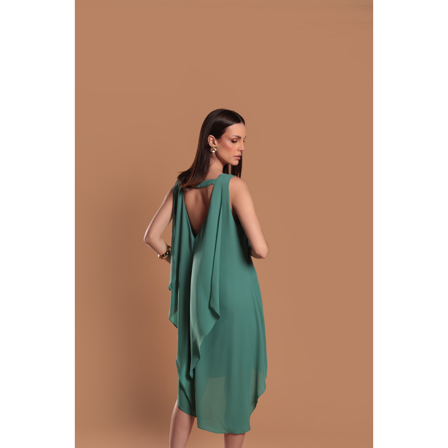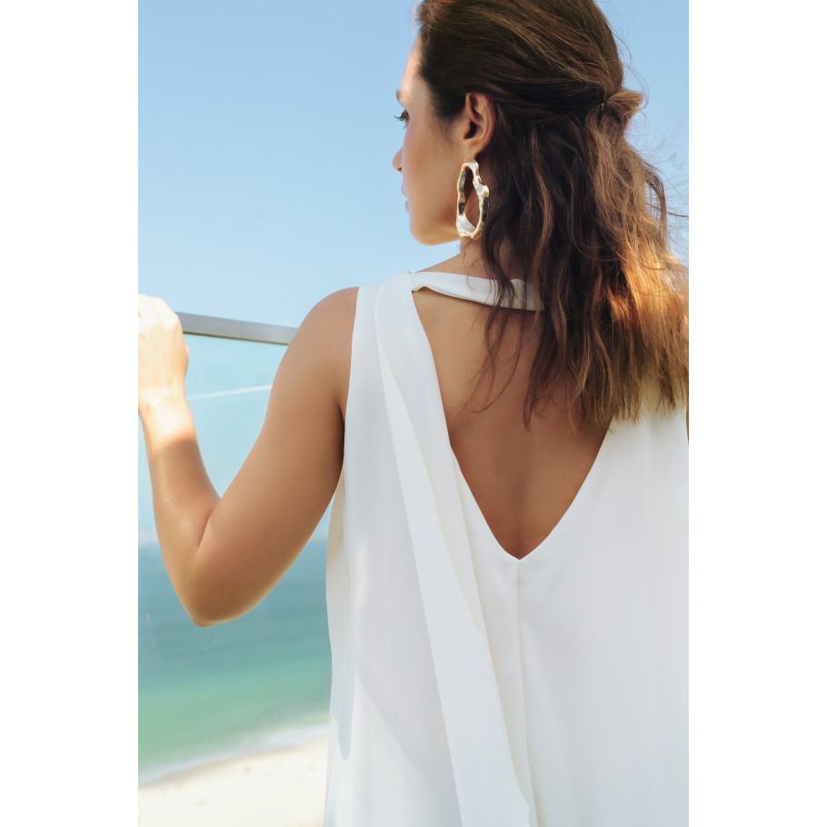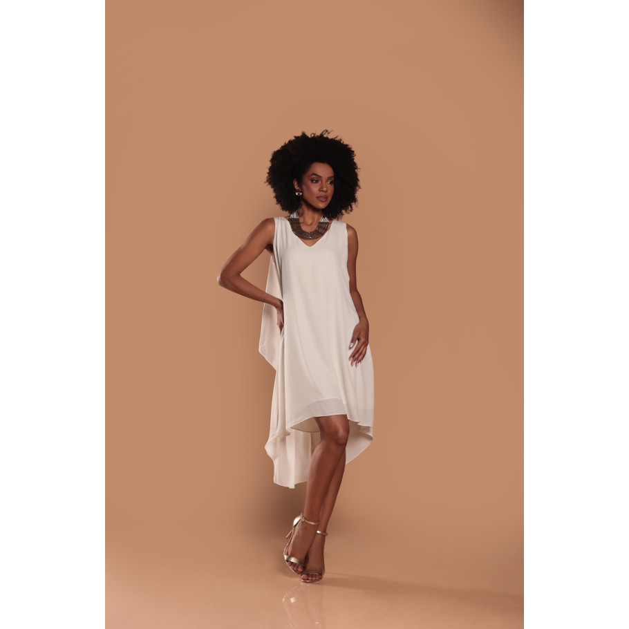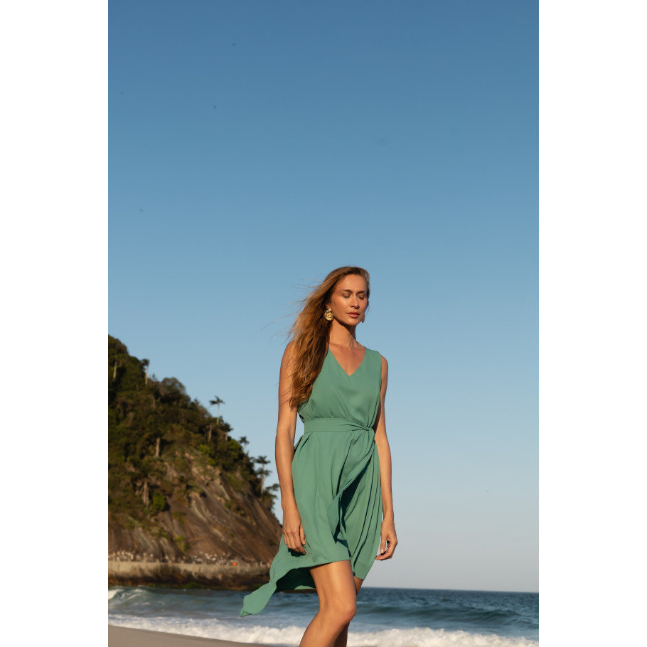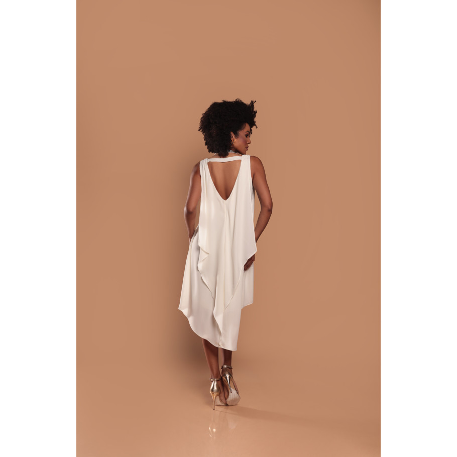 Vestido em crepe, recorte assimétrico, decote em V nas costas, acompanha faixa do mesmo tecido. Um vestido leve, fluido e moderno.