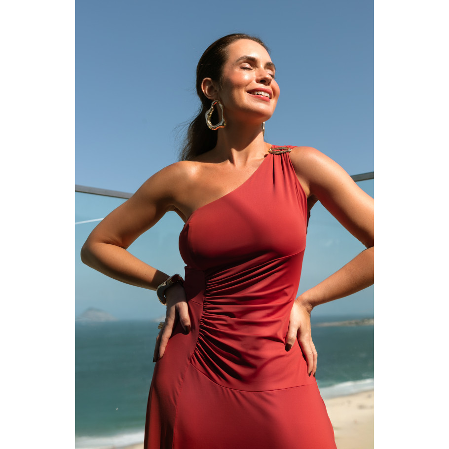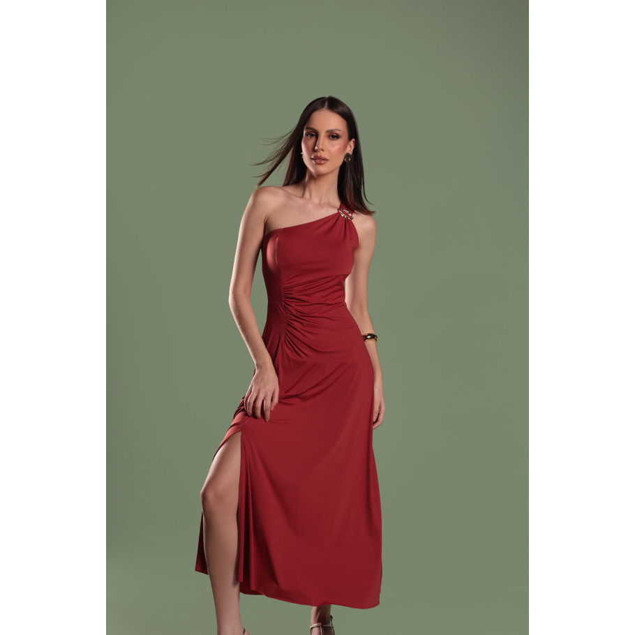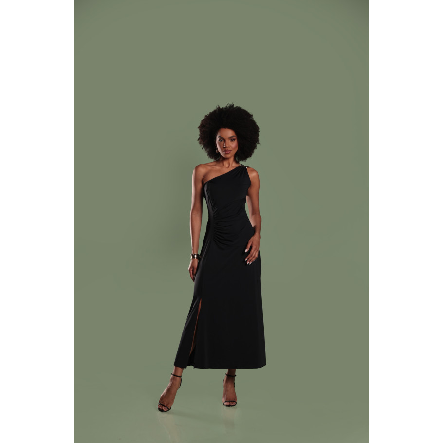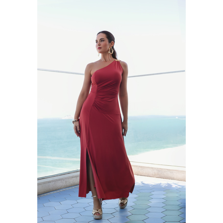 Vestido em malha fluity, um ombro só, alça com detalhe em metal dourado, drapeado na lateral da cintura, fenda lateral. Uma peça sofisticada, leve e elegante.