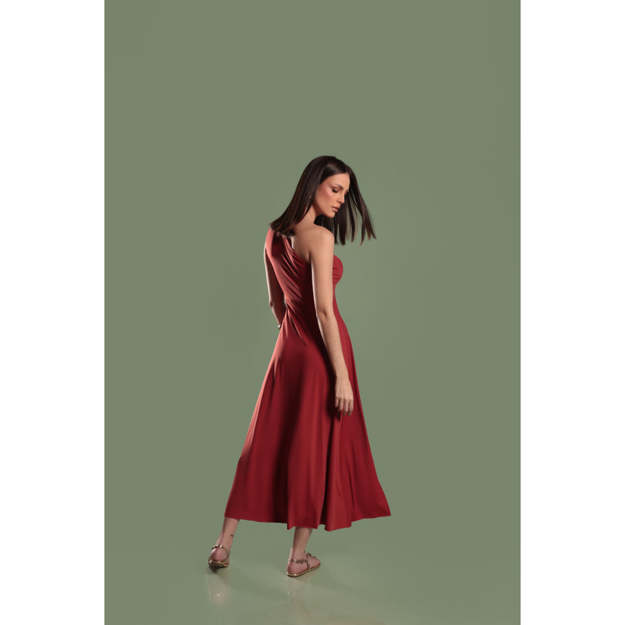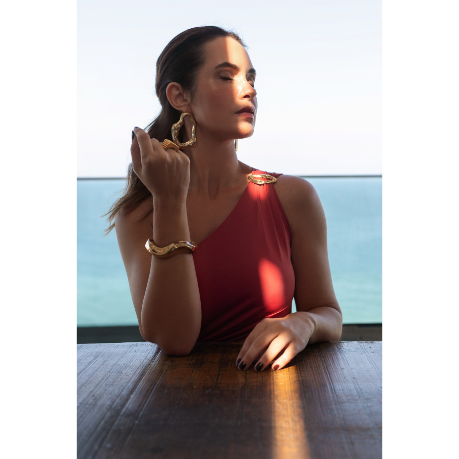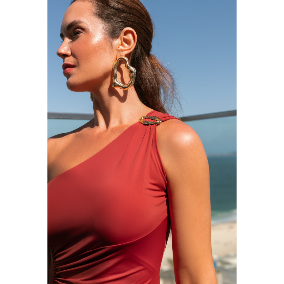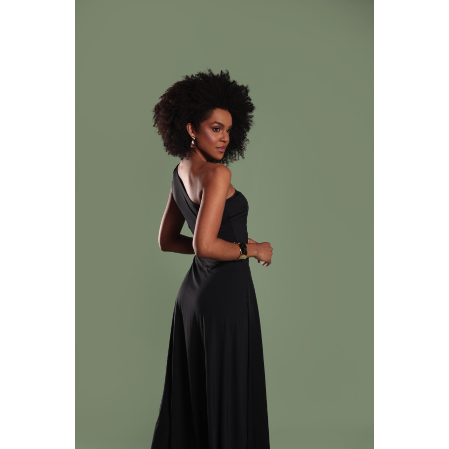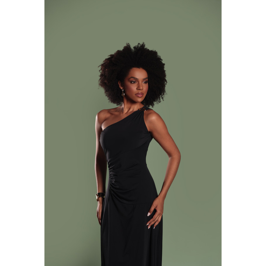 Vestido em malha fluity, um ombro só, alça com detalhe em metal dourado, drapeado na lateral da cintura, fenda lateral. Uma peça sofisticada, leve e elegante.