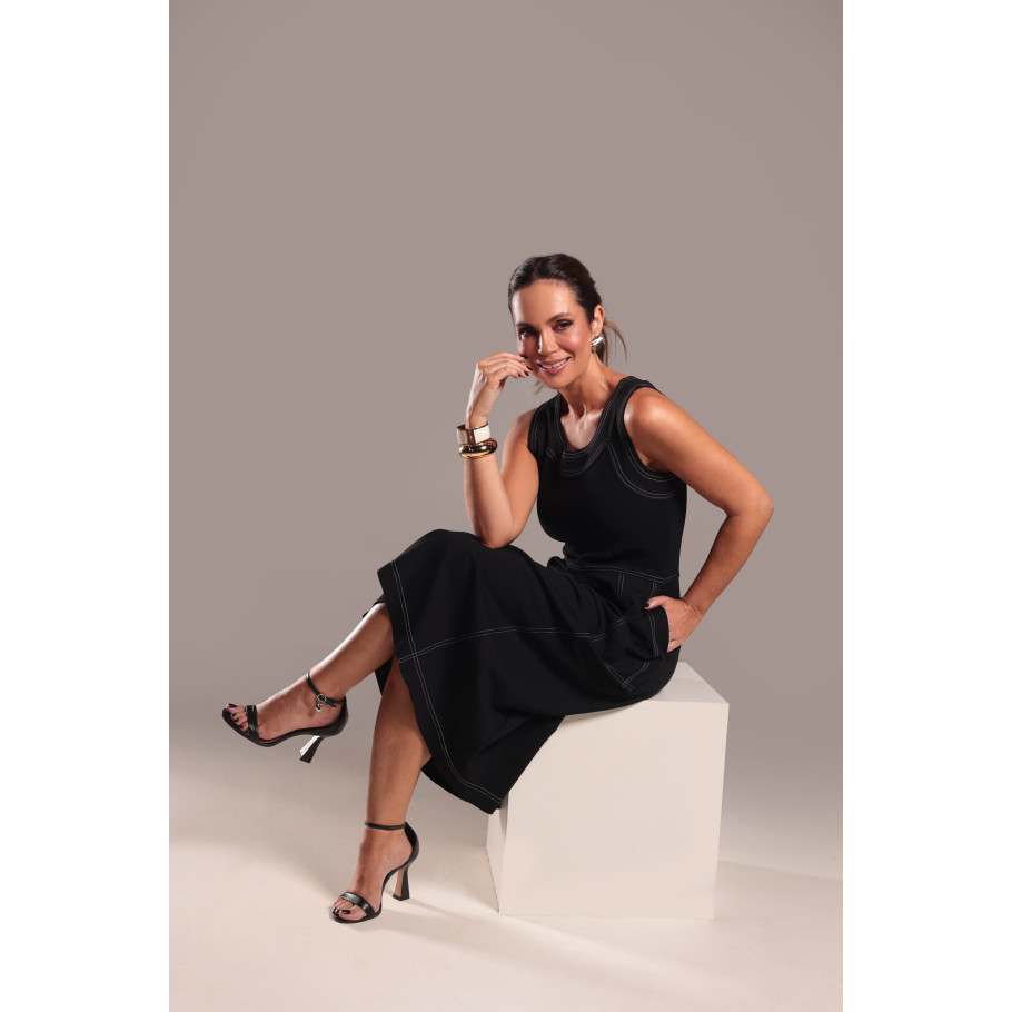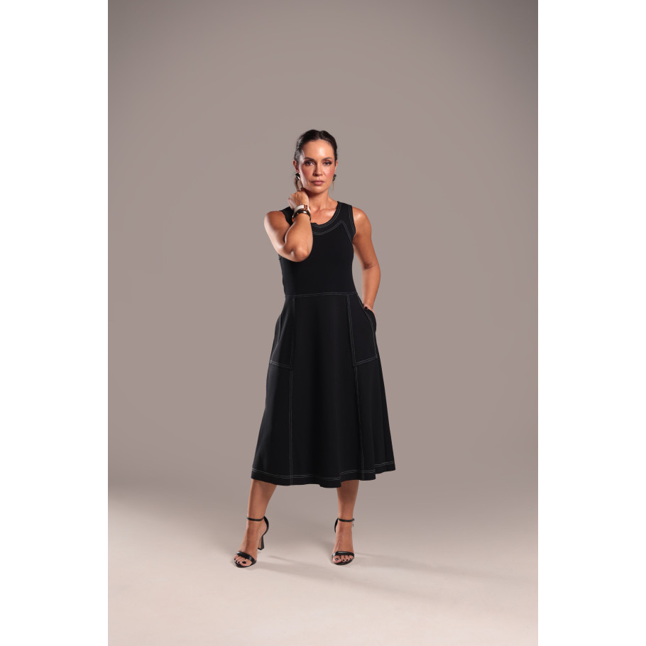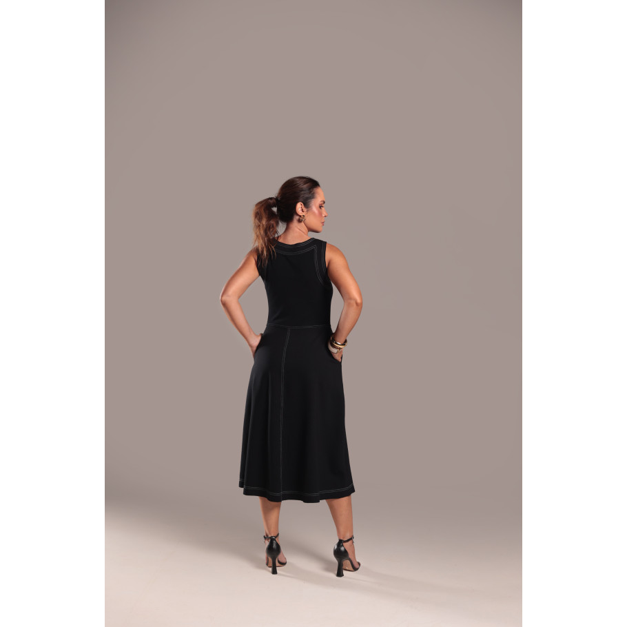 Vestido em malha, corpo com tecido que lembra um canelado mais sofisticado, saia em malha premium, regata, bolsos frontais, comprimento mídi. todo pespontado na cor off white contrastando com o preto .