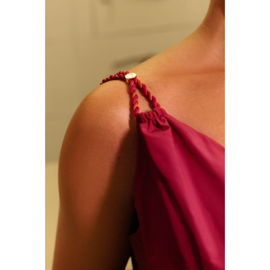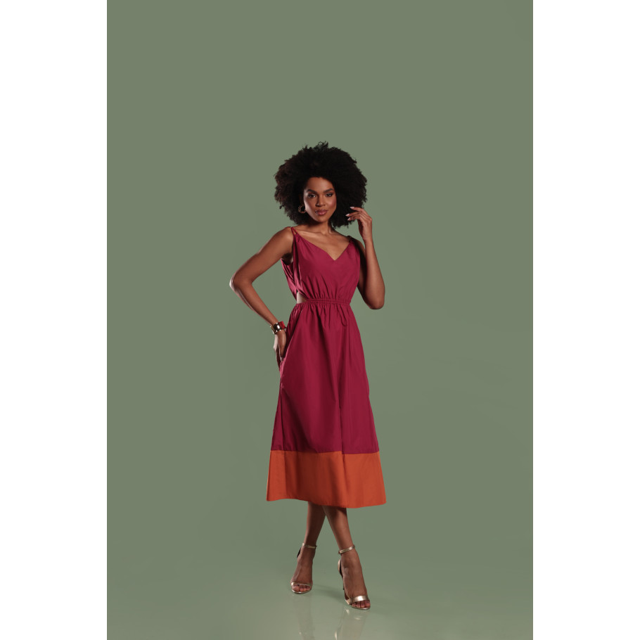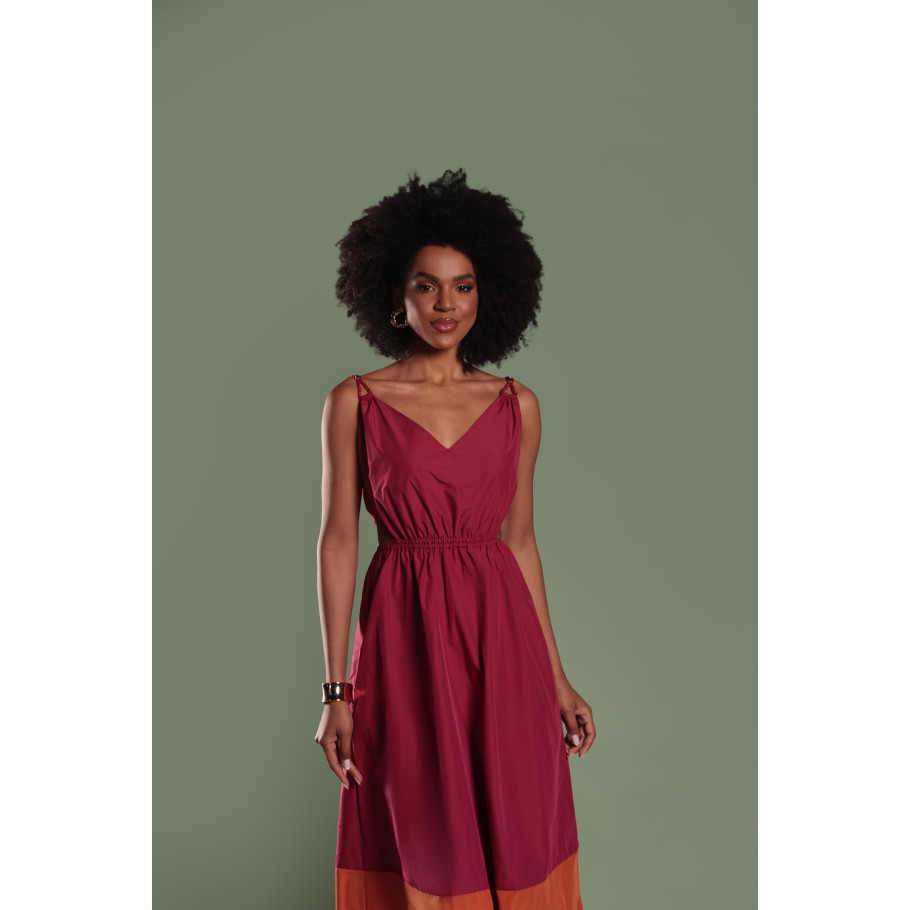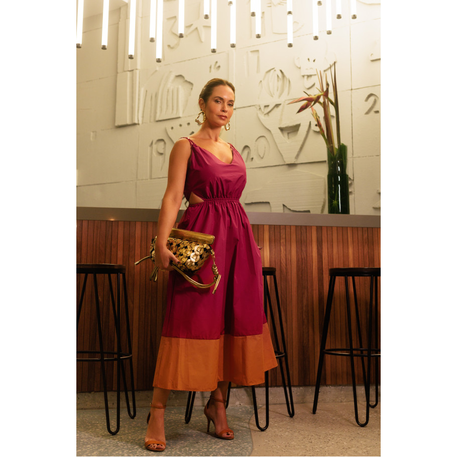 Vestido mídi em tafetá memory, alças em cordões de algodão torcido com detalhe em metal dourado, recorte e elástico na cintura, bolsos laterais barrado de cores contratantes. Uma peça elegante, chique na medida.