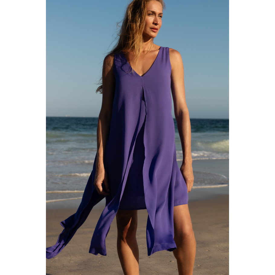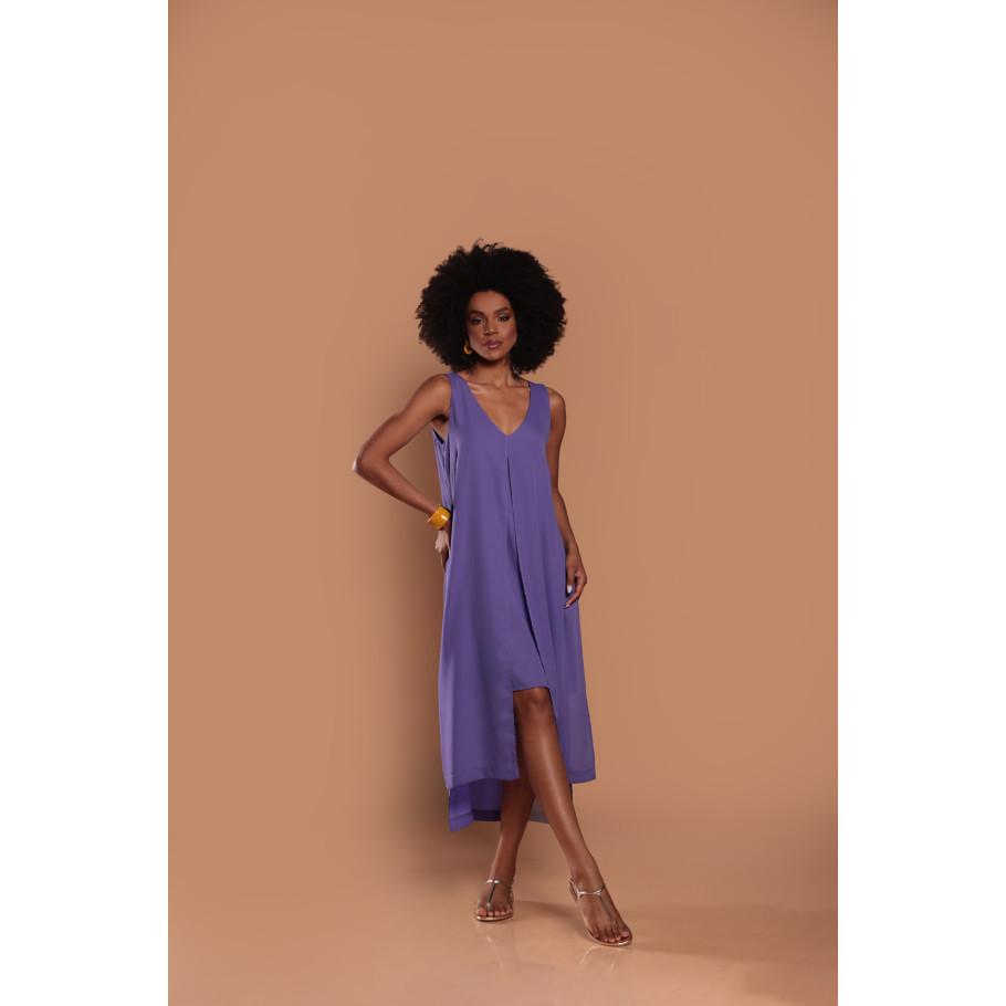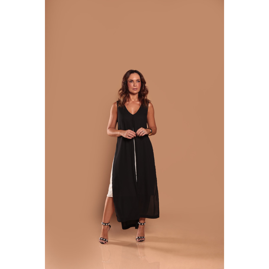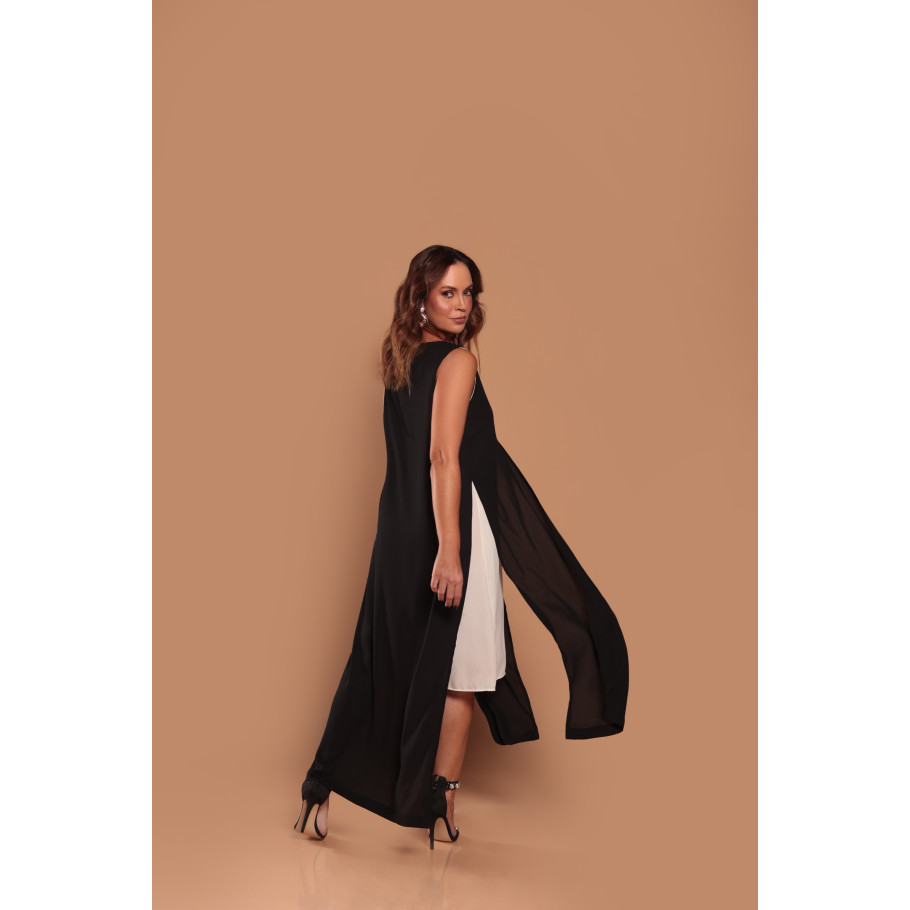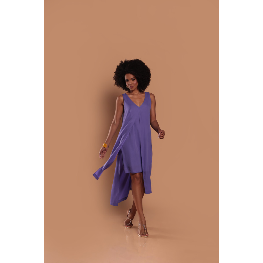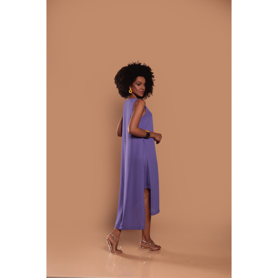 Vestido duplo em crepe, recortes modernos, aberturas nas laterais e frontal, mais alongado nas partes de fora, já na parte fica por baixo o vestido é mais curto dando a sensação de duas peças em uma.