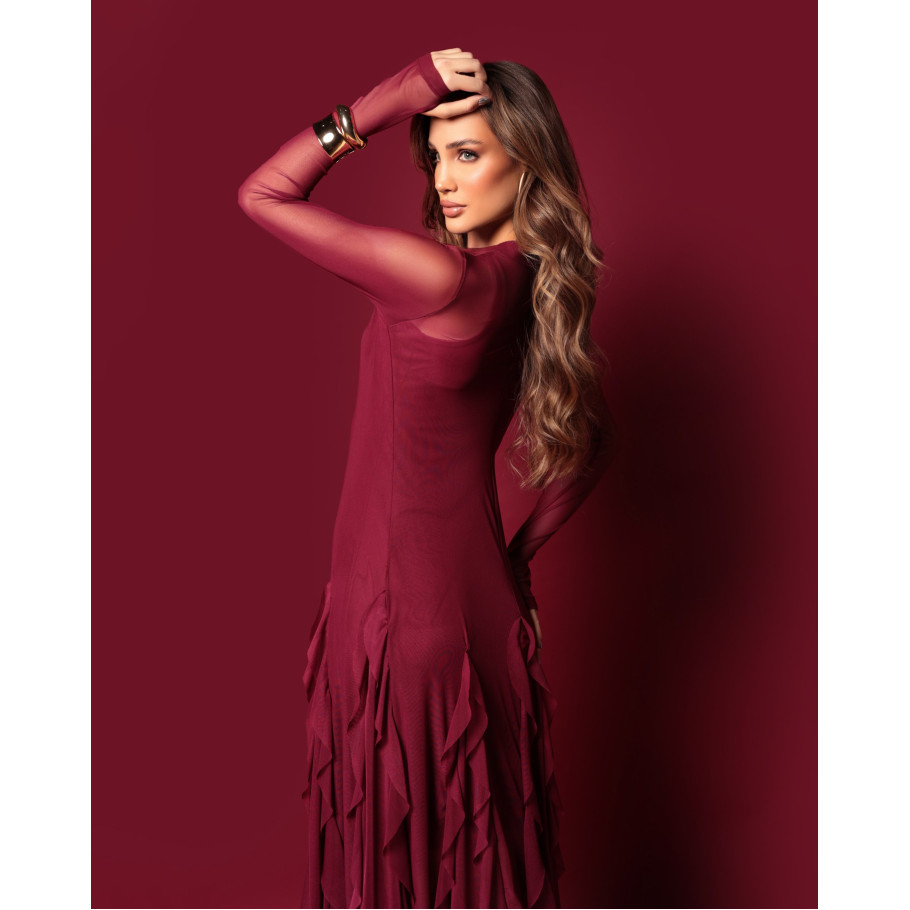 Vestido em tule, mangas longas punho com abertura no dedo, detalhe do barrado todo em recortes a fio que proporciona leveza e movimento a peça. Acompanha combinação em malha decote quadrado.